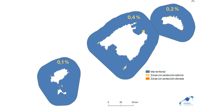 Un informe de la Fundació Marilles ha destacado la insuficiencia en la protección estricta del mar de Balears, con solo un 0,07% del área total bajo protección rigurosa, cifra que se sitúa considerablemente por debajo del 10% sugerido por la Unión Europea. Según el estudio, esta área comprende únicamente 52,96 km2 de los 72.552 km2 totales del mar Balear.
