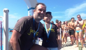 @Noudiari / Fue uno de los momentos más emotivos de la Posidonia Race. Carlos Ramón, fundador de la ONG ibicenca Juntos, cruzó la línea de meta después de 10 kilómetros de travesía con un tiempo de 3h34’27» y cumplió la promesa que le hizo a Álvaro, el niño ibicenco de 6 años que está luchando contra el cáncer. Ramón terminó en 3 horas y 34 minutos y, al llegar a la playa, fue recibido por Álvaro, que fue el encargado de entregarle la medalla como premio por haber superado el reto.