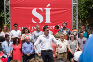 En su discurso, Sánchez cargó contra el líder popular, Mariano Rajoy, al que calificó como «un presidente en B», pero sobre todo contra el candidato de Podemos, Pablo Iglesias, advirtiendo de que el «cambio no tiene intermediarios» y que «quien apoye a Iglesias está votando contra el PSOE».