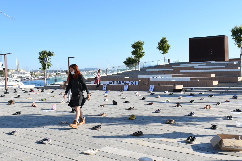 NouDiari / Con el lema Covid hoy, crisis climática mañana, actuad YA, el movimiento internacional de desobediencia civil pacífica Extinction Rebellion (XR) ha llevado a cabo una acción en Ibiza que ha consistido en cubrir la plaza junto al monumento de los Corsario del Puerto de Ibiza de zapatos, «exigiendo participación ciudadana y actuación inmediata contra la emergencia climática en el proceso de reconstrucción tras la crisis de la COVID-19».