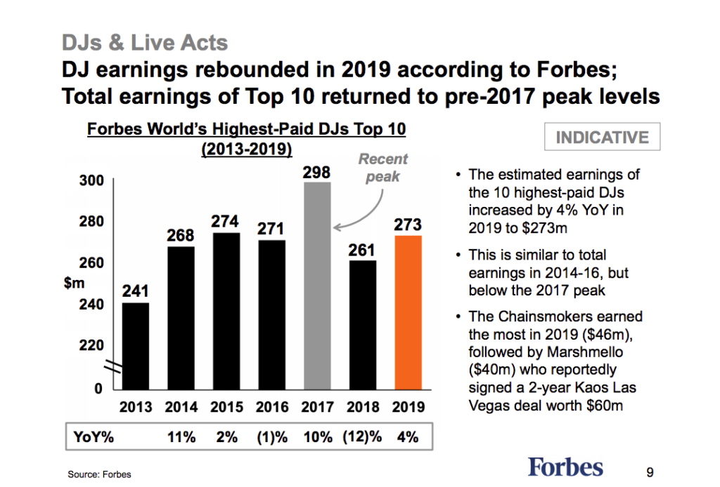 En general, el IMS destaca que en 2019 la música electrónica gozó de buena salud a nivel global, con datos como que los 10 djs que encabezan la lista de los más cotizados ingresaron un total de 273 millones de euros a lo largo del año y en todos los escenarios donde actúan, lo que supone una notable recuperación con respecto a 2018, cuando fueron 261 millones, aunque sin llegar a los 289 millones de 2017, cuando alcanzaron su máximo de ingresos.