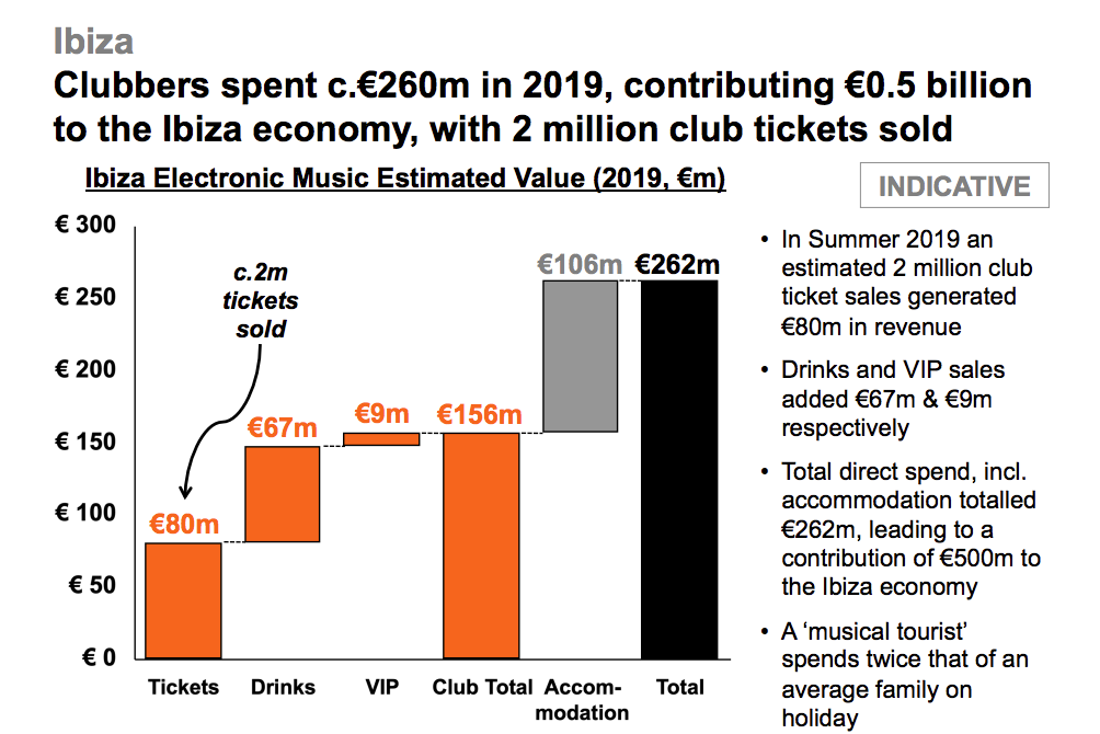 El informe indica que los turistas de este sector gastan el doble en la isla que la media de una familia de vacaciones y que el impacto total es de unos ingresos de unos 500 millones de euros, ya que hay que sumar muchos otros gastos del clubber en destino, no solo entradas y alojamiento.