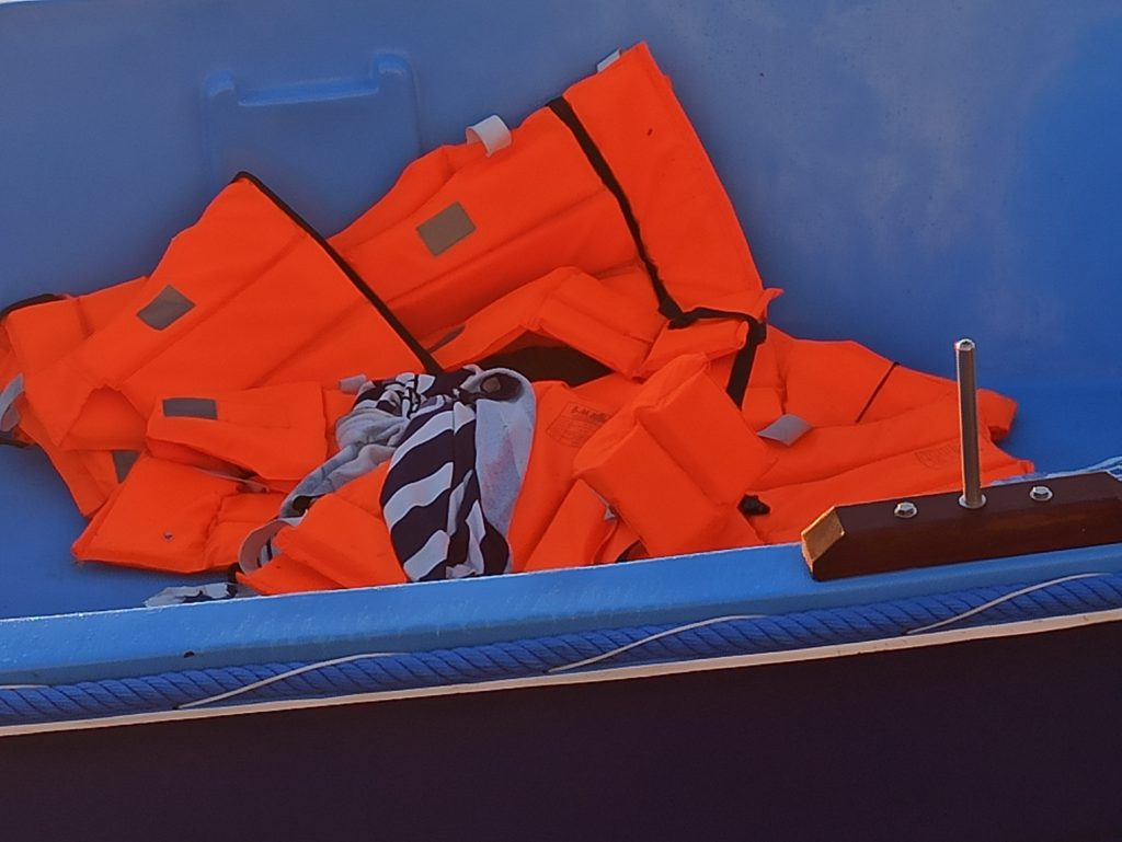 La embarcación permanecía varada en la costa de es Viver esta mañana y en el interior de la misma se podía observar una decena de chalecos salvavidas tirados sobre la cubierta.