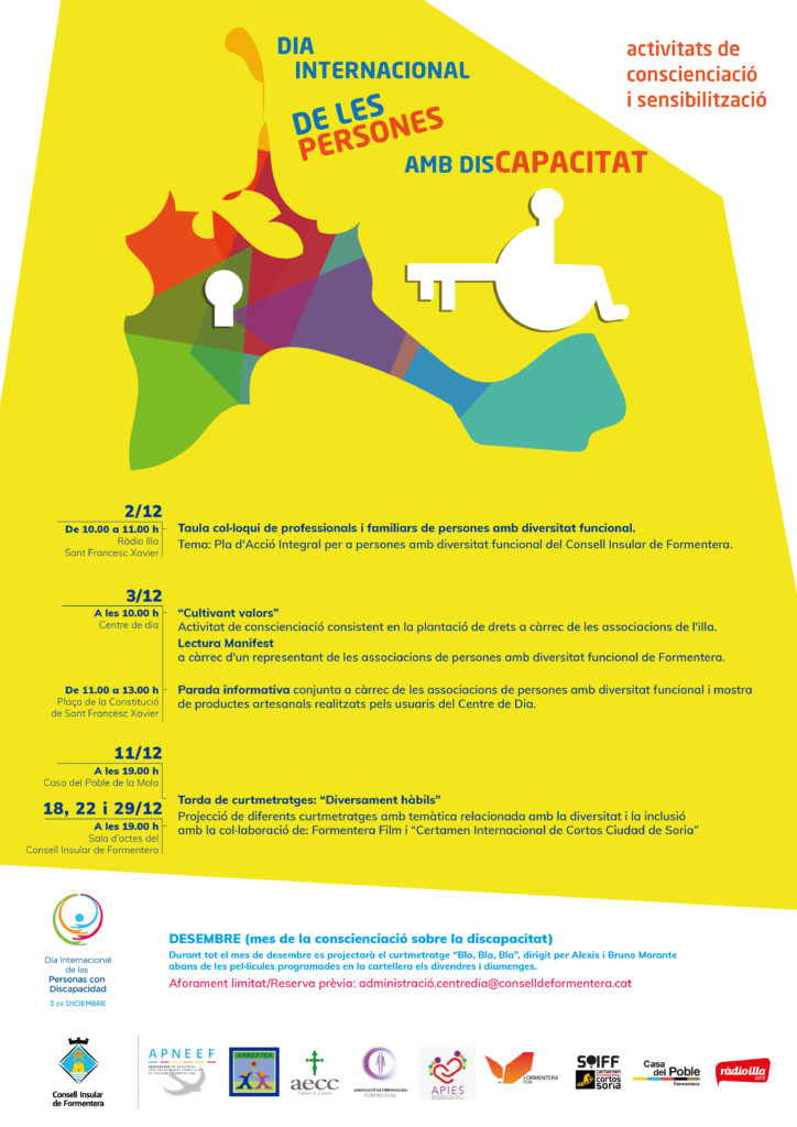 Els dies 11, 18, 22 i 29 de desembre es projectaran diferents curtmetratges amb temàtica relacionada amb la diversitat i la inclusió amb la col·laboració de: Formentera Film i ‘Certamen Internacional de Cortos Ciudad de Soria’. El dia 11, a les 19 hores, la projecció es farà a la Casa del Poble de la Mola, i els dies 18, 22 i 29 de desembre, a la mateixa hora, a la sala d’actes del Consell de Formentera.