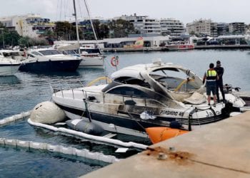 El yate que se hundió hace cuatro días mientras estaba amarrado en el puerto deportivo de Marina Ibiza tras sufrir ...