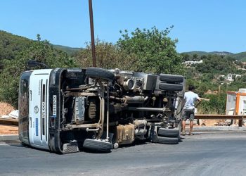 Un camión de dos ejes cargado con material de obra (maderas) ha volcado este mediodía, sobre las 13.00 horas, en ...