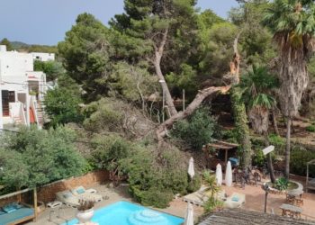 Un pino de grandes dimensiones se ha desplomado hoy junto a la piscina de un establecimiento hotelero de Santa Eulària ...