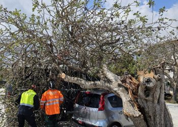 Un algarrobo se desploma sobre una persona y dos coches en Puig d’en Valls