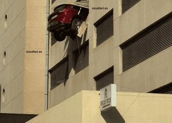 Una de las estampas del verano. Un coche ha quedado colgado de una tercera planta de un aparcamiento de Ibiza. ...