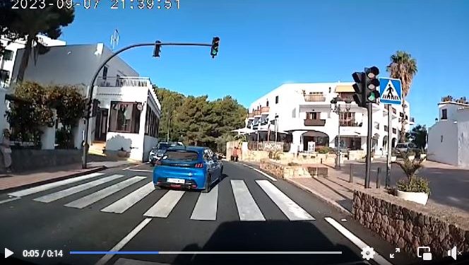 La Policía Local de Sant Josep ha compartido hoy en sus redes sociales un vídeo en el que se puede ver cómo un conductor, que circula por la calle principal de Sant Josep, aprovecha que el semáforo está en rojo y los coches parados en ambos sentidos para hacer un adelantamiento negligente e imprudente justo en el momento en que la luz se pone verde.