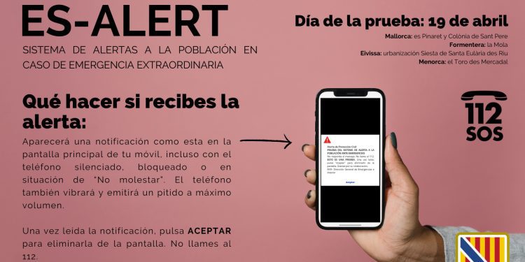 Las Illes Balears probarán mañana viernes 19 de abril el sistema de alertas a la población, conocido como ES-Alert o 112 inverso, que permite el envío generalizado e inmediato de notificaciones emergentes en caso de emergencia extraordinaria o catástrofe a los teléfonos móviles conectados a las redes de telefonía dentro de un área determinada.