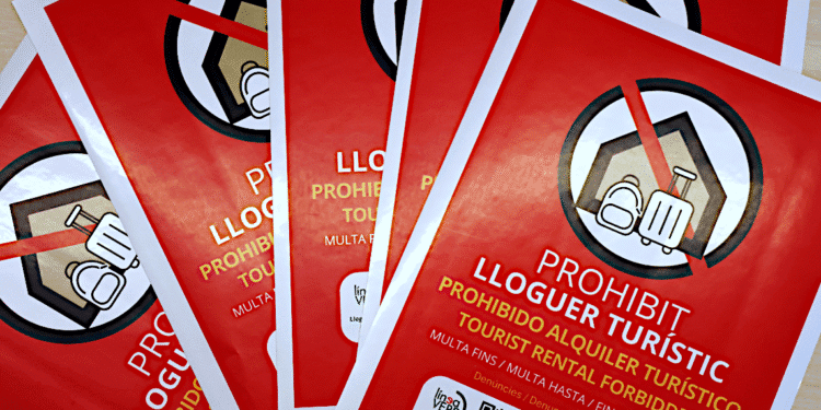 El cartel informa sobre la Ley 8/2012 de Turismo de las Illes Balears que prohíbe que se lleve a cabo el alquiler turístico en edificios residenciales plurifamiliares, cuya sanción se ha incrementado hasta los 500.000 euros a través del decreto ley de medidas de contención turística.