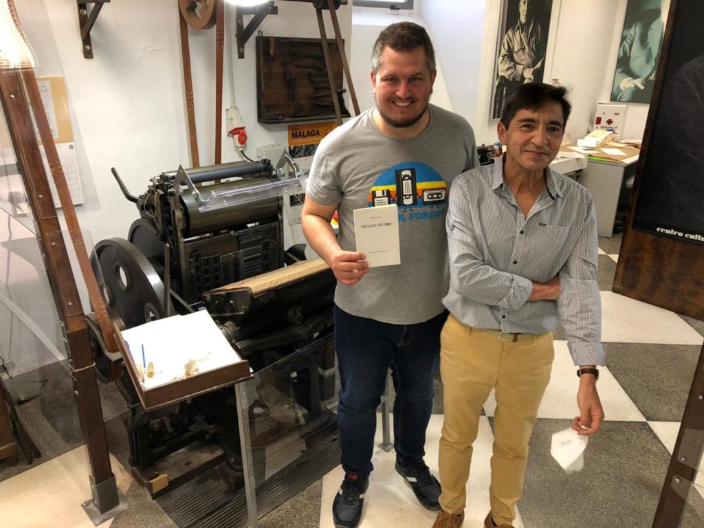 Ben Clark y José Andrade, cajista impresor que ha compuesto, caracter a caracter, todo el libro en la Imprenta Sur de Málaga. Foto de Daniel Díaz Godoy