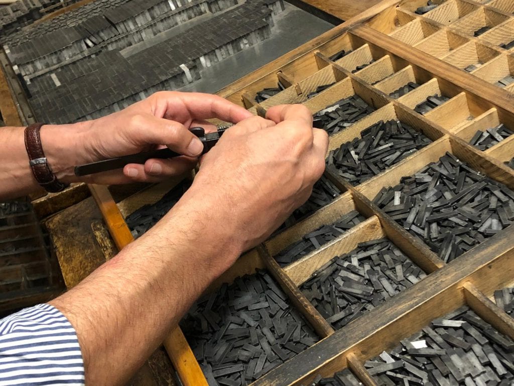 José Andrade con los tipos de la impresora. Foto de Daniel Díaz Godoy