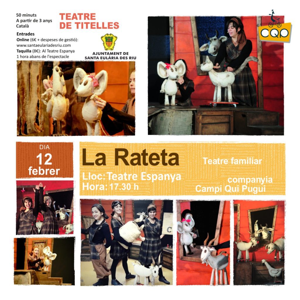 Ya están disponibles, a través de la sección de ‘venta de entradas’ de la web www.santaeulariadesriu.com, las entradas para los dos espectáculos infantiles que se han programado el fin de semana del 12 y 13 de febrero, coincidiendo con las fechas principales de las fiestas de Santa Eulària. Se trata de la obra ‘La rateta’, una propuesta de teatro musical y de títeres de la compañía Campi Qui Pugui; y ‘Historias desde el verde’, una selección de historias de la cuentacuentos Maricuela.