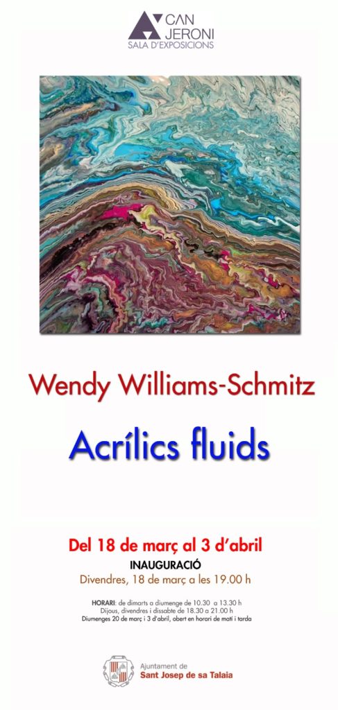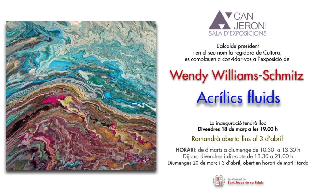 L’Ajuntament de Sant Josep inaugura el divendres (18 de març) a les 19 hores l’exposició ‘Acrílics fluids’ al Centre de Cultura Can Jeroni, amb obres de Wendy Williams-Schmitz després del seu pas a l’abstracció pictòrica. L’exposició es podrà visitar fins al 3 d’abril en l’horari habitual de la sala.