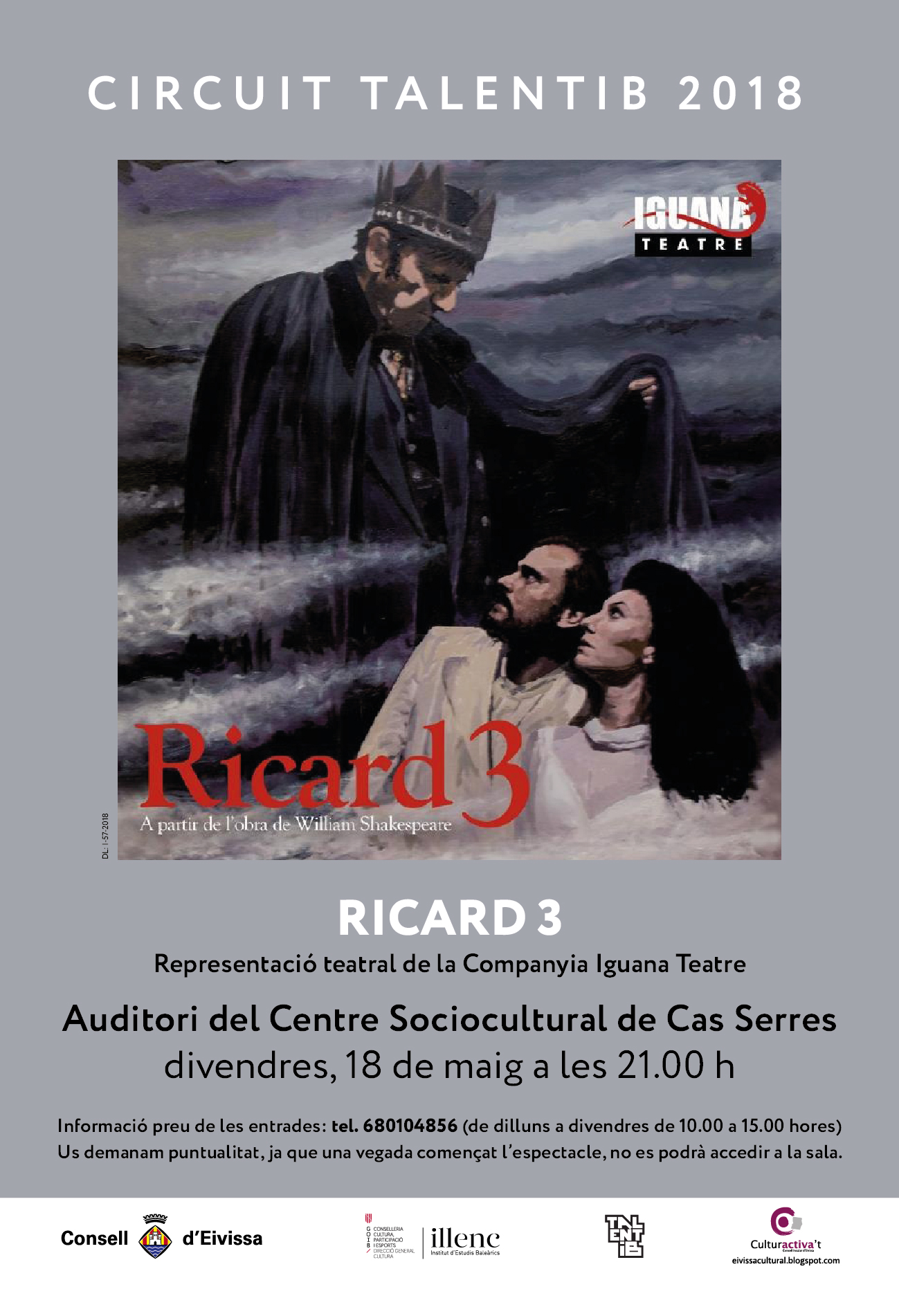 ‘Ricard 3’ arriba a Eivissa gràcies al Consell d’Eivissa i del Govern Balear, de la mà del Circuit Talentib. L’obra està dirigida per Pere Fullana i interpretada per Carles Molinet, Josep Orfila i Lucía Sánchez. El preu de l’entrada és de 15 euros si s’adquireix el mateix dia en taquilla, o de 8 euros si es compra anticipadament. Les entrades anticipades es poden adquirir al Centre Sociocultural de Cas Serres entre les 10.30 i les 19 hores.