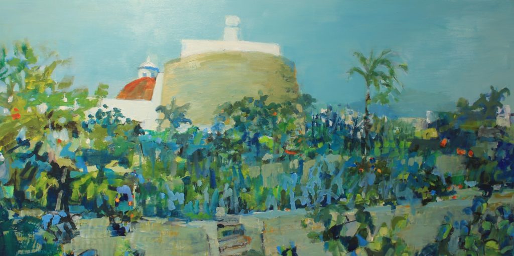 Si en la segunda propuesta el verde desaparece, en la ganadora del tercer premio es uno de los actores primordiales. La obra de Nuria López Torres apuesta por un formato panorámico para retratar la parte de la torre del Puig de Missa, pero dotando de un gran protagonismo a la vegetación de la zona, por lo que son los tonos verdes y verde azulados los que marcan la obra.