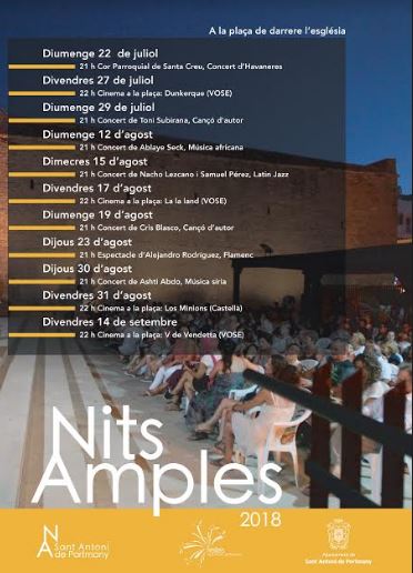 @Noudiari / Por tercer verano consecutivo, la plaza Norte, situada junto a la iglesia de Sant Antoni, acogerá el festival Nits Amples que incluye diferentes actuaciones y proyecciones al aire libre. El festival empezará este domingo, a las 21 horas, con un concierto de habaneras a cargo del Coro Parroquial de Santa Cruz.