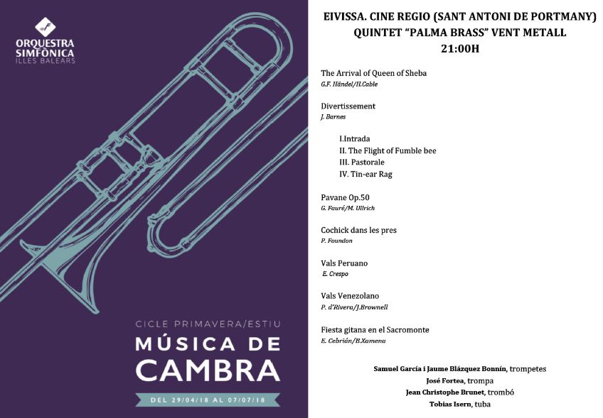 @Noudiari / El penúltimo concierto del ciclo de música de cámara llega a Eivissa, en el Cine Regio (Sant Antoni de Portmany) el 5 de julio a las 21:00h. El Quintet “Palma Brass” Vent Metall interpretará: The Arrival of Queen of Sheba (G.F. Handel/H.cable); Divertissement (J. Barnes); Pavane Op. 50 (G.Fauré/M.Ullrich); Una fiesta gitana en el Sacromonte (E. Cebrián/b.Xamena); Vals Peruano (E. Crespo); Vals Venezolano (P. D’Rivera/J.Brownell) y Cochick dans les pres (P. Foundon).