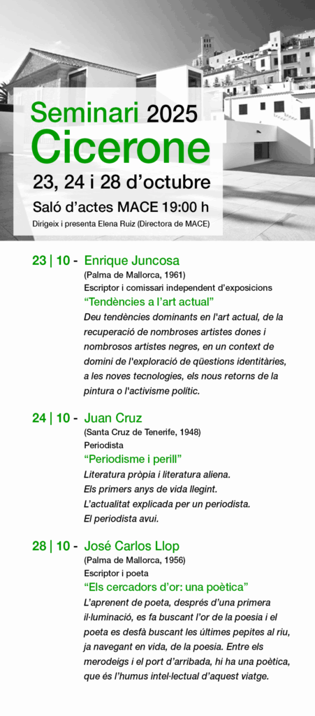 Tras una primera etapa celebrada de manera ininterrumpida entre 2012 y 2017, y su exitosa reanudación el año pasado, el Seminario Cicerone 2025 continúa consolidándose como un espacio abierto a la cultura, la teoría del arte y la reflexión sobre el mundo contemporáneo. Esta continuidad ha sido posible gracias a la colaboración de AMICS MACE, que ha impulsado la reactivación del proyecto compartiendo la misma vocación de apertura y compromiso con el público, y del Ajuntament d’Eivissa.