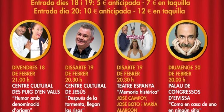 El espectáculo de este viernes lleva por título ‘Humor amb denominació d’origen’ y junta sobre las tablas del auditorio a José Boto y Laura Moreno, quienes centran su propuesta en un humor localista que ha dado grandes resultados con otras propuestas como la obra ‘Ocho apellidos ibicencos’ del propio Boto. En este caso el espectáculo está recomendado a partir de 14 años y el precio de las entradas es de cinco euros si se reservan a través de la web y de siete euros si se compran en taquilla una hora antes del inicio de la función.