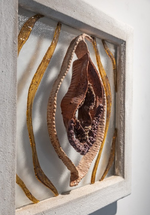 Entre las figuras que aparecen en las piezas, hay algunas que evocan a una vulva aunque la artista la señala también “como una barca”, y añade que la femenidad no es ajena a toda esta exploración personal a través de los materiales: “Para mí es un homenaje muy personal a todas las mujeres de mi entorno, de toda mi vida, en especial a una amiga que ya no está, que fue una maestra mía y con la que aprendí mucho del arte. Aprendí una cosa que para mí es muy importante, que es de lo que habla la muestra, que es cómo compaginar el ser artista con la crianza, con la maternidad, con el trabajo, con el sostener el resto de la vida”.