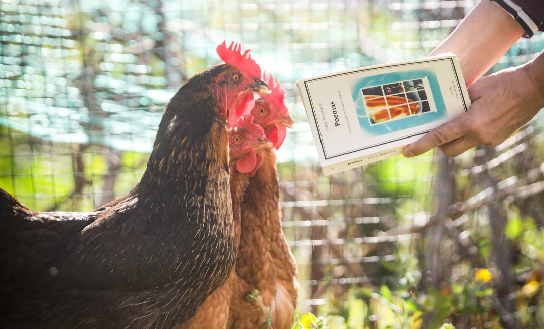 Detalle del cartel de Toni Planells donde unas gallinas se muestran interesadas por la obra de Emily Dickinson.