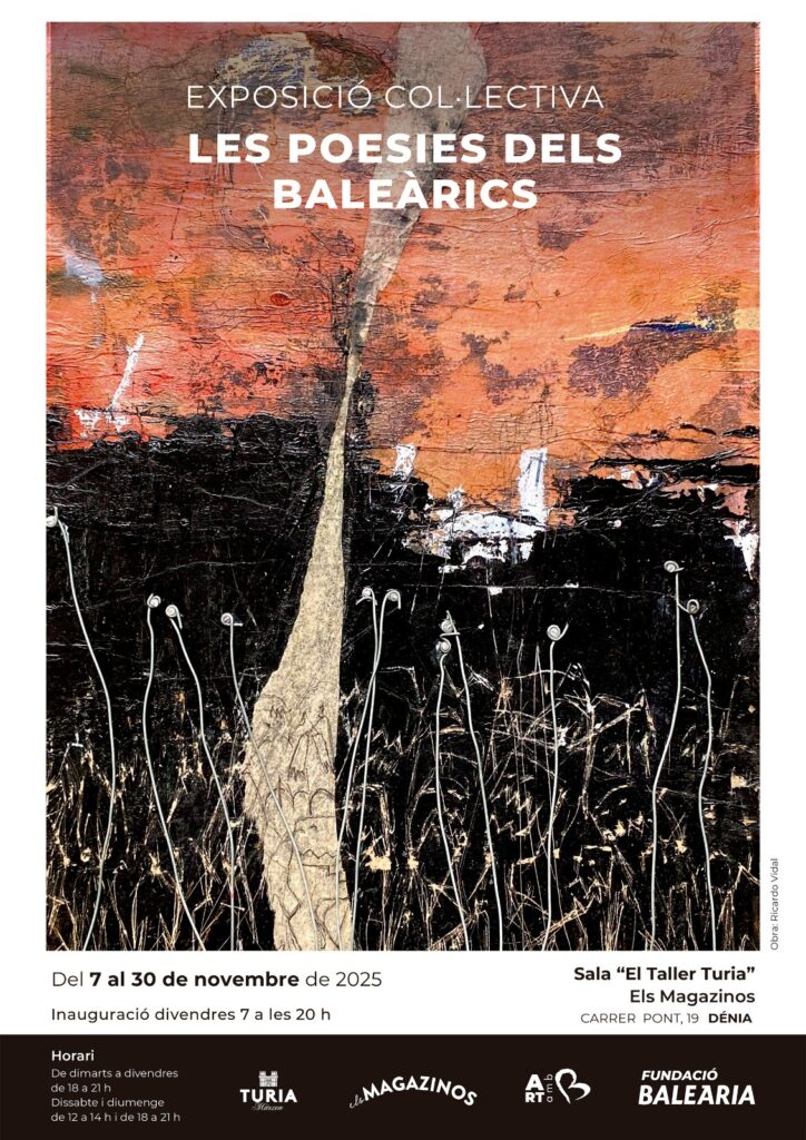 La exposición “Les poesies dels Baleàrics” podrá visitarse del 7 al 30 de noviembre en el espacio cultural Els Magazinos (📍 Carrer Pont, 19 — Dénia, Alacant). La muestra, organizada por la Fundació Baleària, forma parte de su programación cultural dedicada a estrechar lazos entre las Islas Baleares y la Comunitat Valenciana, y estará abierta al público dentro del horario habitual del recinto.