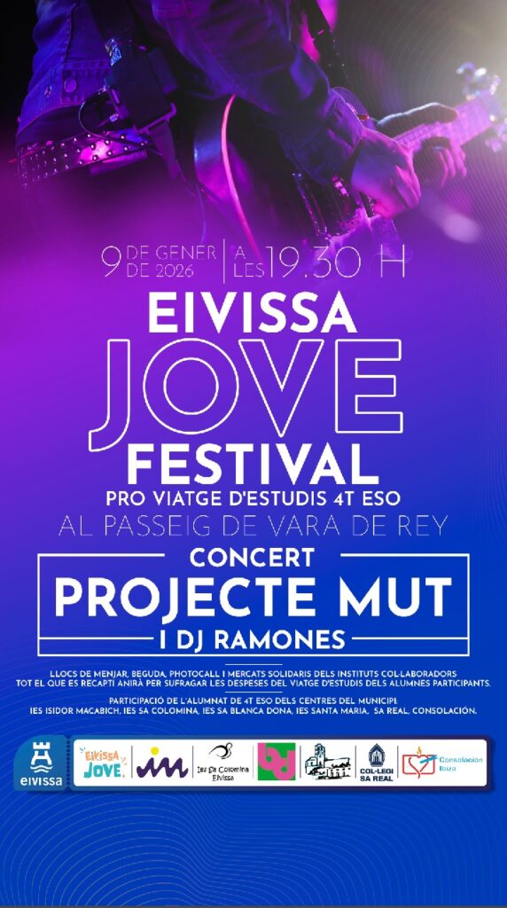 Uno de los grupos con más estima de la isla, Projecte Mut, actuará este viernes en la carpa navideña de Vara de Rey, en un evento organizado por seis institutos del municipio y que ha sido bautizado como el Eivissa Jove Festival. La iniciativa, enmarcada dentro del área de Juventud, forma parte de la programación Eivissa, Ciutat de Nadal, y comenzará a partir de las 19:30 horas.