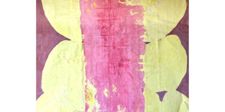 La artista trabaja al aire libre con los elementos para dar vida a lienzos crudos, reuniendo colores con el sol, el viento y la lluvia para formar nuevas composiciones, que reflejan una potente profundidad y expansibilidad.