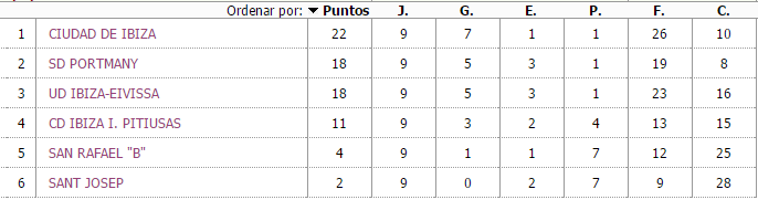 En los otros partidos, el CD Ibiza Illes Pitiüses ha goleado al San Rafael B (4-0) con dos tantos de Behar y uno de Angorrilla y Álvaro García, mientras que el Portmany le ha endosado media docena al Sant Josep (6-0) por mediación de Rubén Núñez (2), Francisco Bonilla (2) y Alejandro Bonilla (2).
