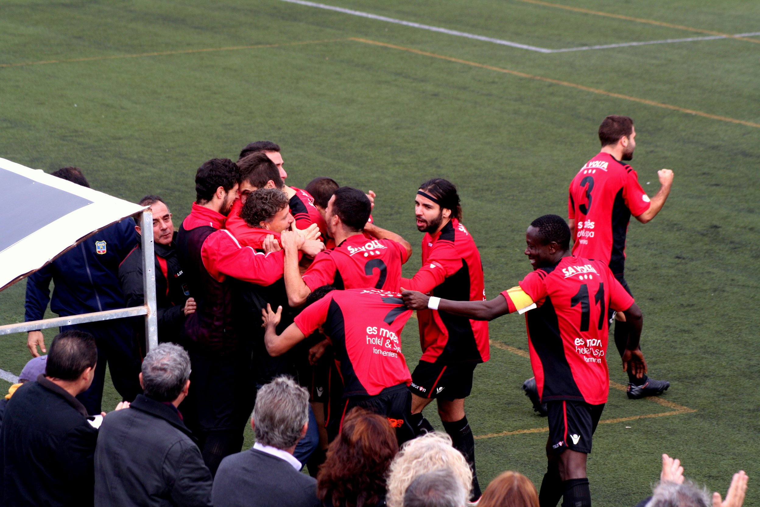 Los jugadores del Formentera la consecución de un gol en el banquillo