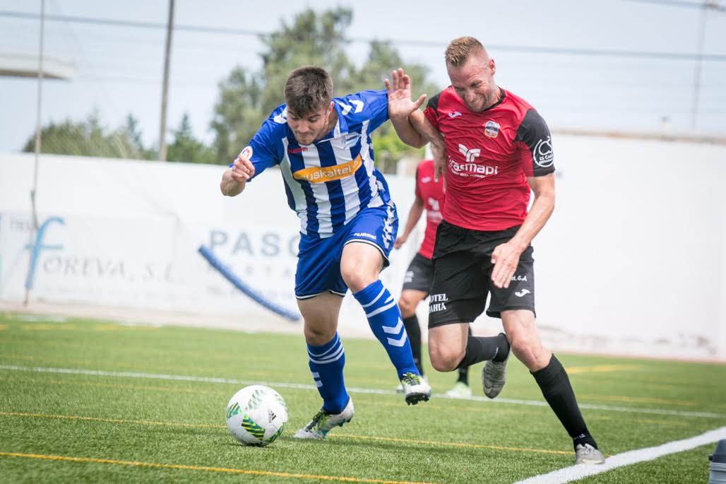 Pep Toni Bartolomé / La Sociedad Deportiva Formentera ha dado este mediodía una nueva alegría a su afición con la victoria por 2 a 0 ante la Alavés B, en el partido de ida del playoff de ascenso a Segunda B, disputado al Municipal de Deportes de Formentera. Un encuentro en el que los de Tito García Sanjuán han dominado el primer tiempo, y los de Aitor Orueta la segunda mitad. El partido ha sido muy atractivo futbolísticamente y los dos equipos han demostrado un altísimo nivel competitivo.