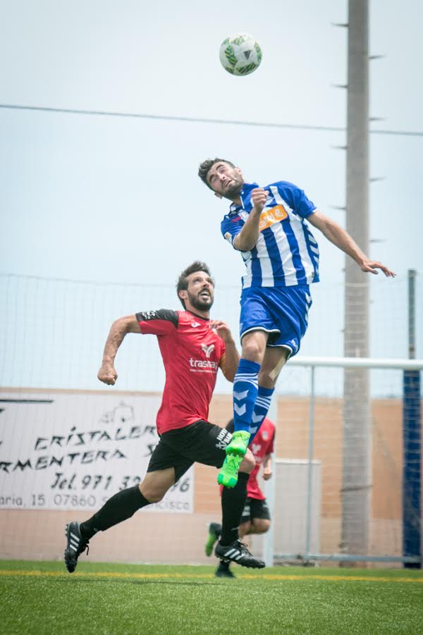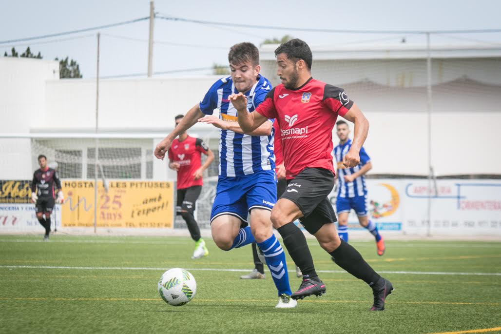 En los primeros 15 minutos, el choque por el ascenso ha estado muy abierto para las dos formaciones, donde se han producido llegadas en área contraria pero sin eficacia. En el minuto 18, el Formentera ha tenido premio con una de sus jugadas favoritas, a balón parado. Cómo es habitual, Willy ha sido el encargado de sacar desde la esquina. Su centro, por el que luchaba Juan Antonio, ha rebotado en la cabeza del capitán vasco, Erik, quien ha introducido el cuero en su propia puerta.