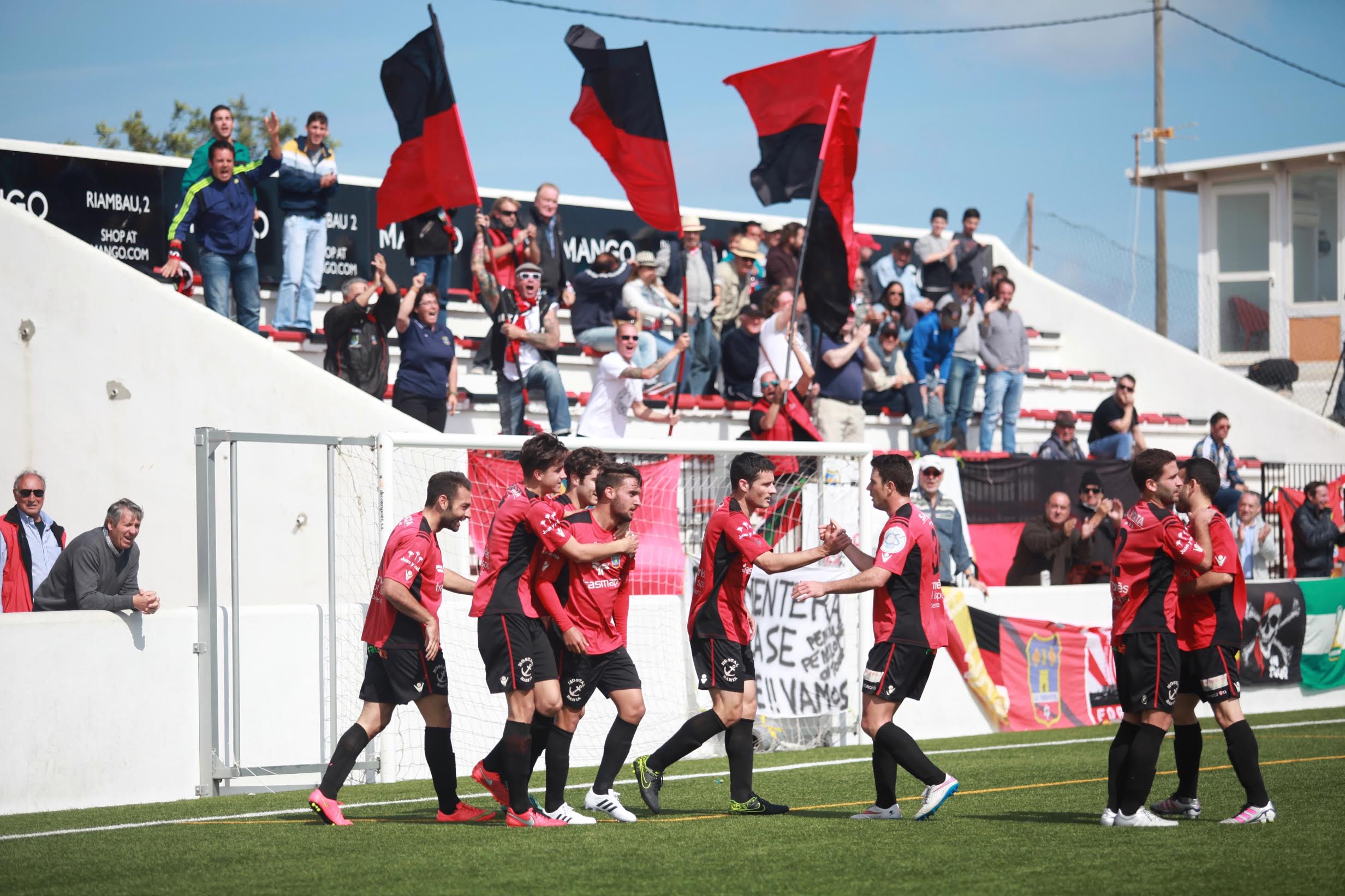 Jugadores del Formentera celebran la consecución de un tanto en un partido de Liga