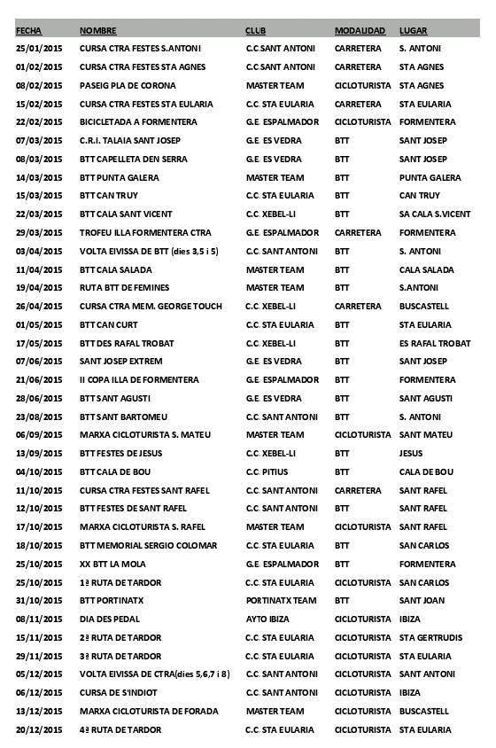 Por último, en 2015 habrá un total de doce pruebas cicloturistas, de las cuales las más importantes son el Día del Pedal, el 8 de noviembre, por el número de participantes, y la Vuelta Cicloturista a Ibiza, que el próximo año pasará a ser de cuatro días (5, 6, 7 y 8 de diciembre) y que incluye otra vez a la Cursa de s’Indiot, el 6 de diciembre.