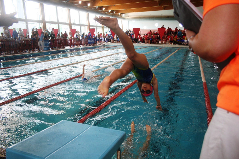 Una nadadora salta a la piscina para tomar el relevo de su compañera.
