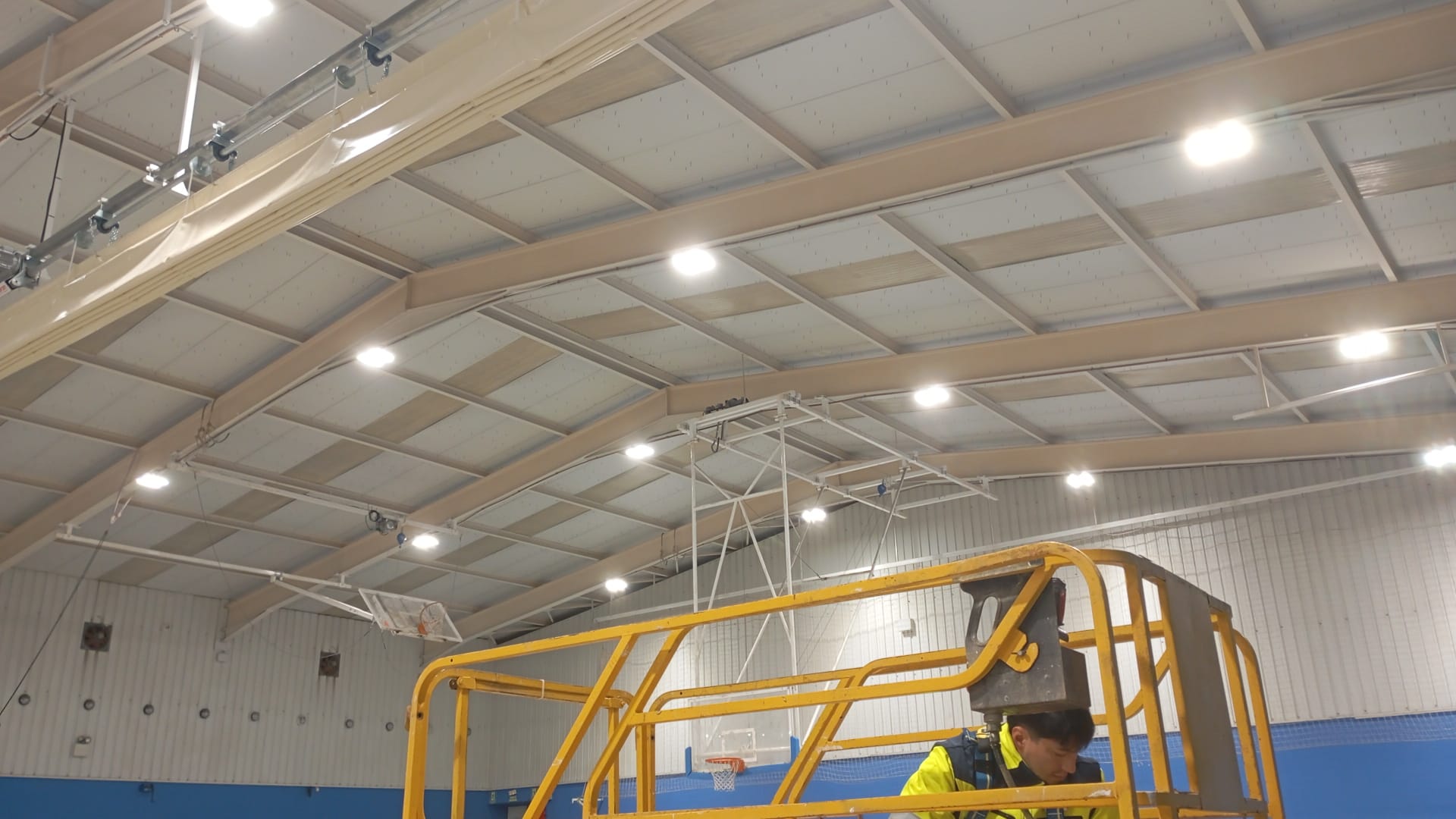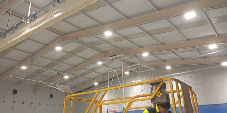 La concejalía de Deportes del Ayuntamiento de Ibiza ha ejecutado unos trabajos de sustitución integral de la iluminación del pabellón polideportivo de Es Pratet, donde se han instalado 32 nuevos proyectores LED, que sustituyen a los antiguos focos halógenos de 400 W.