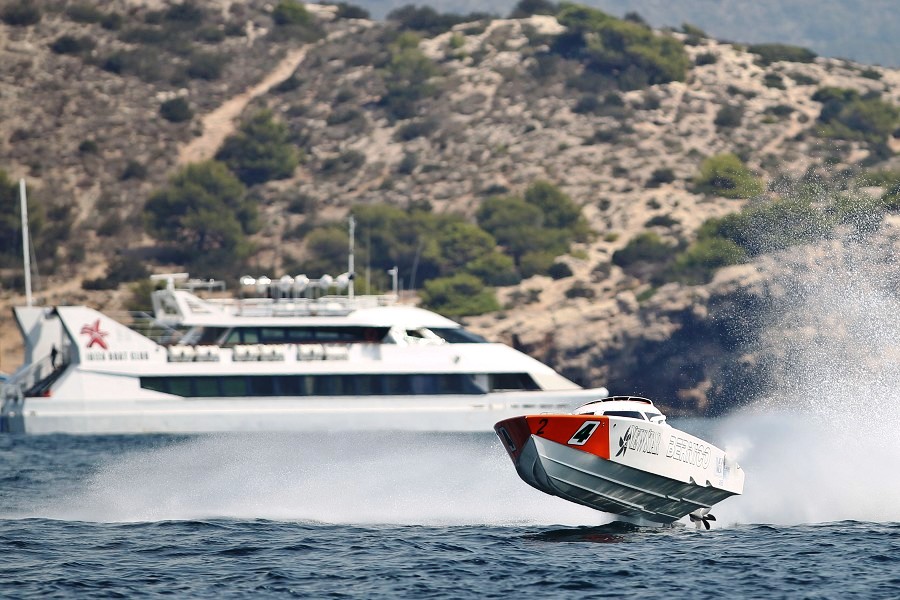 El Team Victory, de los Emiratos Áres, vuela sobre el agua durante un momento de los entrenamientos. Fotos: Class 1/Aquabike
