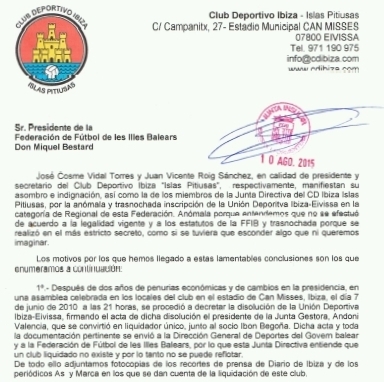 También consideran que, para inscribirse en la FFIB, hace falta una serie de requisitos, como la solicitud de nombre al Registro de Entidades Deportivas del Govern balear, la confección y presentación de los estatutos, comunicación de la junta directiva o la autorización municipal para jugar en el estadio de Can Misses o en el de Can Cantó, pero «todo ello no se hizo y, para más inri, el propio secretario de la FFIB lo admitió a los medios de comunicación».