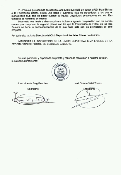 La entidad ha presentado este lunes en la junta insular un escrito dirigido a Miquel Bestard, presidente de la Federació de Futbol de les Illes Balears, para impugnar el alta de la UD Ibiza-Eivissa que, en su opinión, se ha hecho de forma «anómala y trasnochada», porque «no se efectuó de acuerdo a la legalidad vigente ni a los estatutos de la FFIB y se realizó en el más estricto secreto, como si tuviera que esconder algo».