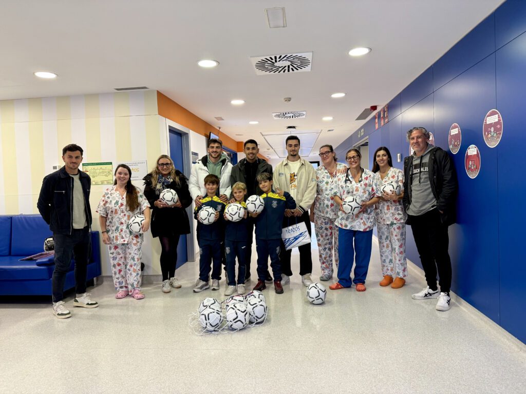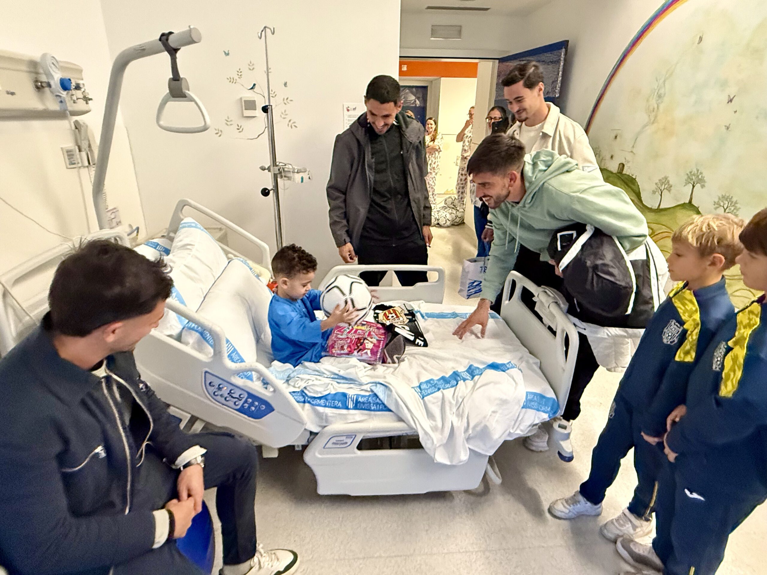 La SCR Peña Deportiva llenó ayer lunes de ilusión la planta de pediatría del Hospital Can Misses, ofreciendo a los niños ingresados un respiro cargado de alegría y deporte. Los jugadores del primer equipo Marc Fraile, Lautaro y Ale Vera, junto a los benjamines Mateo, Yerai y David, el preparador físico Marc Colomar, el entrenador Raúl Garrido y la presidenta del club, Ana María Mateu, recorrieron la planta entregando balones, bufandas y álbumes de cromos. Más allá de los regalos, los futbolistas compartieron risas, palabras de ánimo y unos cuantos toques de balón, generando momentos de emoción y desconexión para los pequeños y sus familias.