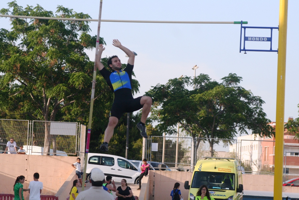 Uno de los participantes en la prueba de pértiga supera el listón.