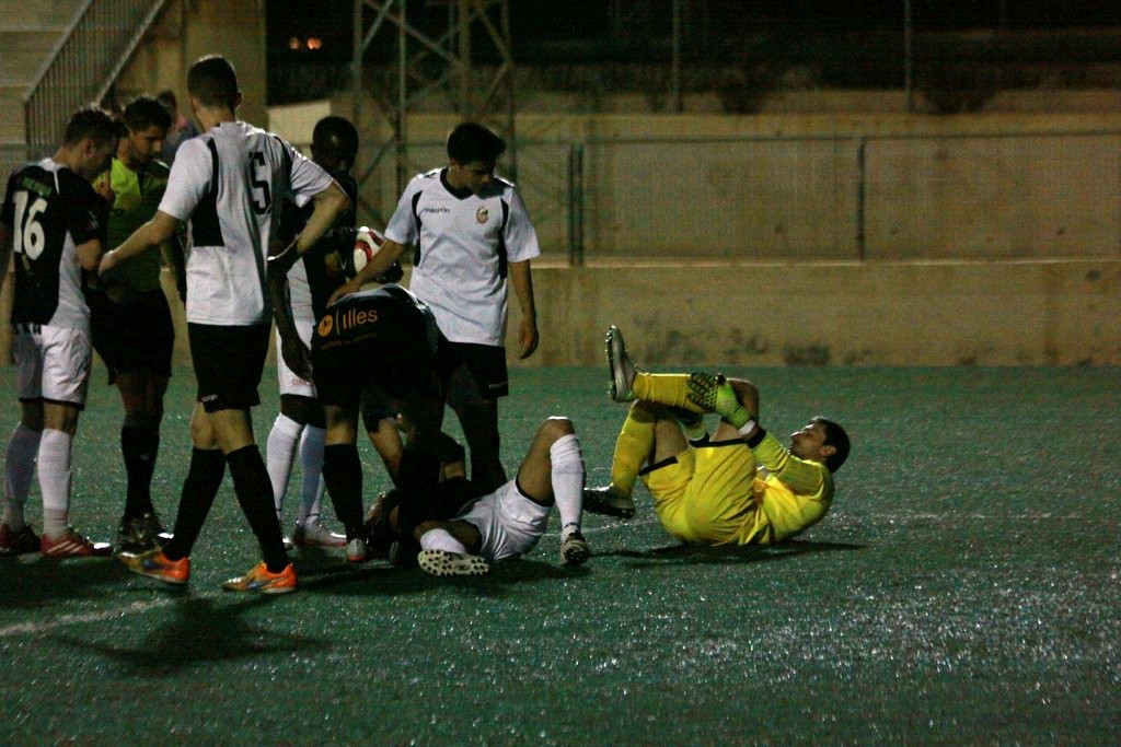 Pacheta abandona el terreno de juego tras el encontronazo con el portero. Fotos: Fútbol Balear