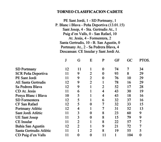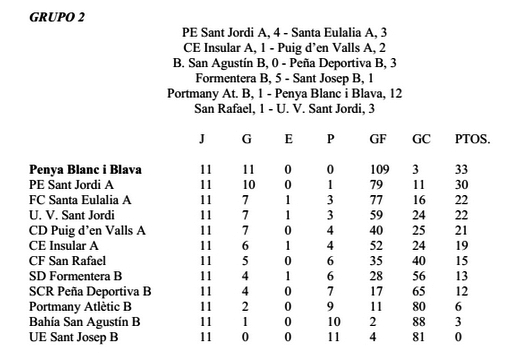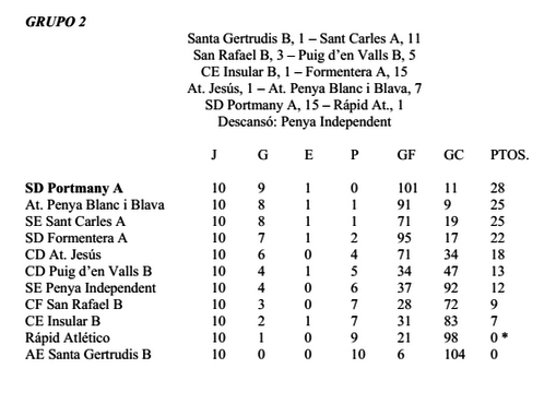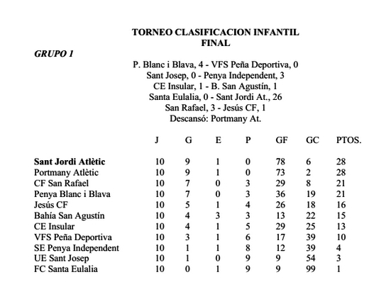 El encuentro que levantó más polémica, precisamente, fue el que apartó al Portmany de sumar un nuevo título -el cuarto- en el grupo 1 infantil. El Sant Jordi, que visitaba el miércoles el campo del Santa Eulalia, necesitaba ganar por 26 goles para arrebatar la primera plaza al Portmany Atlètic y fue precisamente lo que hizo: 0-26, con Iváns Pons (9 goles) y Ettore Condello (7) como máximos realizadores.