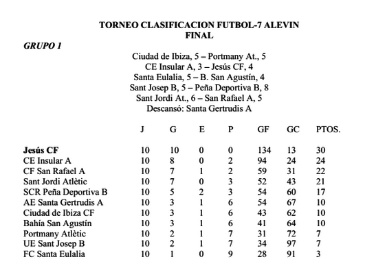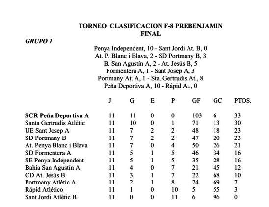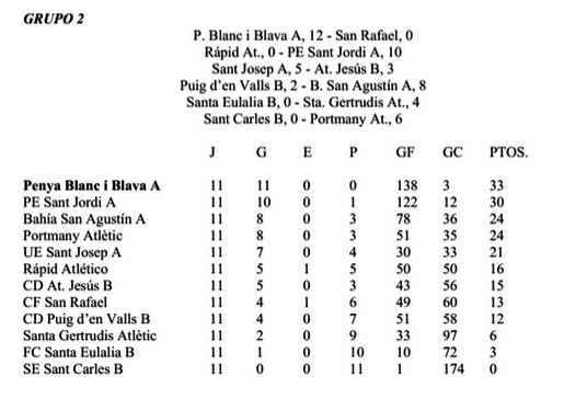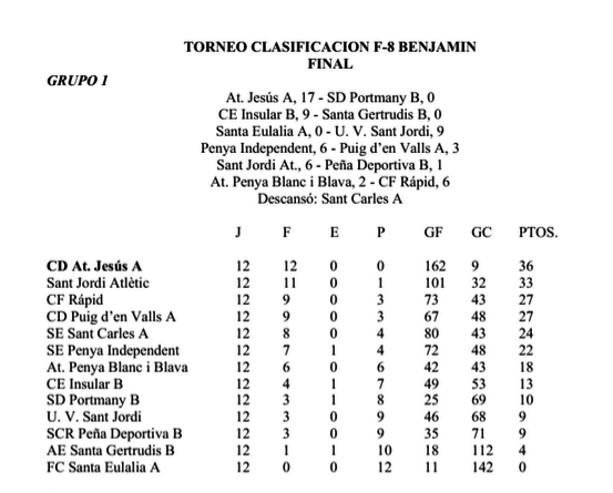 En el grupo 2 infantil, el Atlético Jesús sumó una nueva goleada (14-0 al Puig d’en Valls) para finalizar el torneo con la friolera de 122 goles a favor y 4 en contra, pero esos números no le sirvieron para hacerse con el primer puesto, que fue para la Peña Deportiva después de ganar este sábado al Rápid por 5-0.