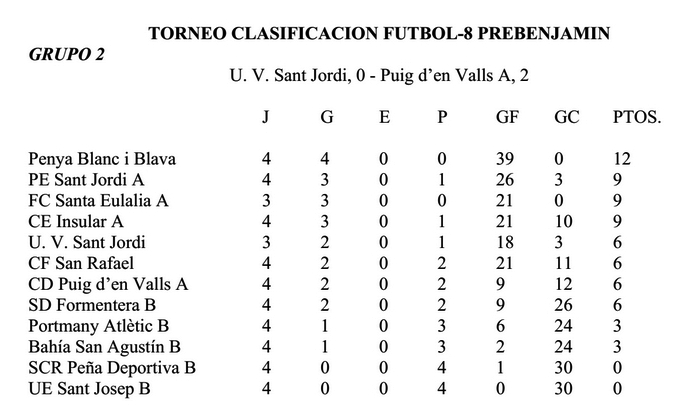 En la competición infantil también se jugaron dos partidos, uno por grupo. En el primero, el Sant Jordi Atlètic venció por 3-1 a la Penya Blanc i Blava, en un partido que no afecta a la clasificación. En el segundo, el Rápid estrenó su casillero de victorias goleando al último clasificado, el Insular Atlètic (9-0).