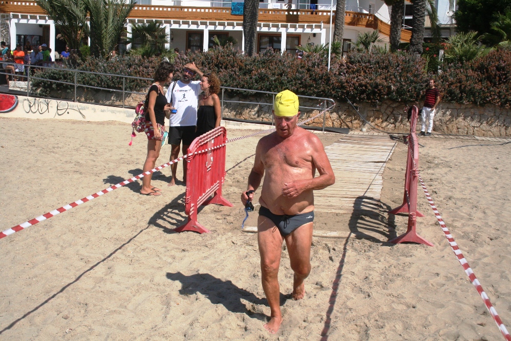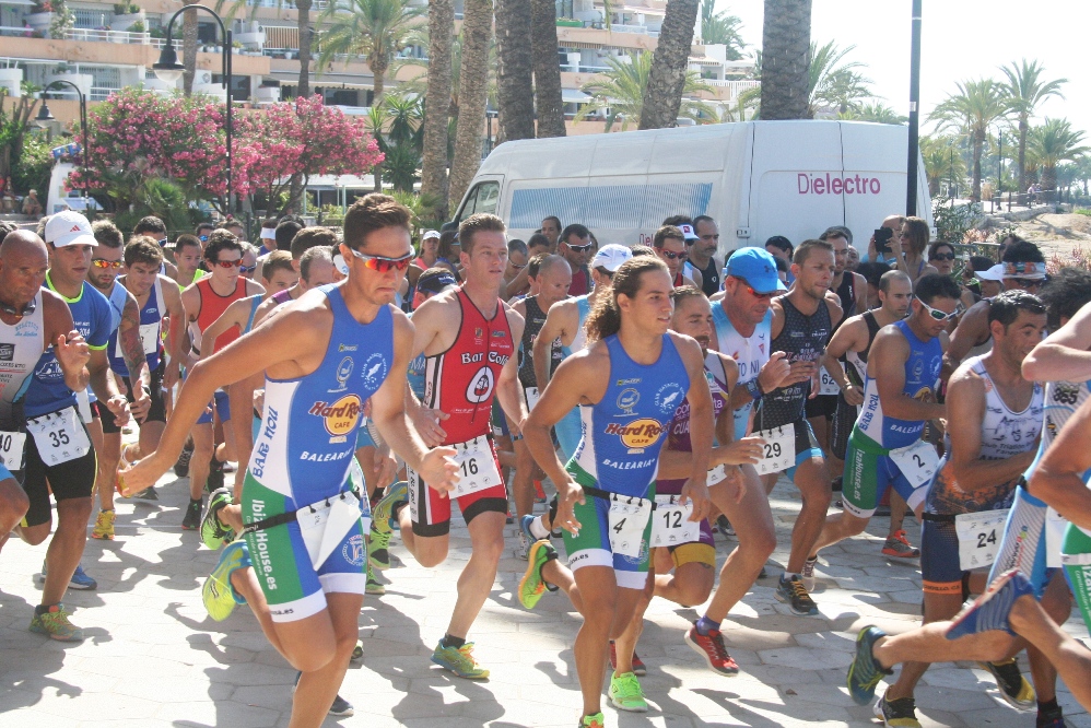 La prueba arrancó a las 10.30 horas con la salida de la categoría masculina, mientras que, sólo dos minutos después, salieron las féminas. Sergi Tur (CN Eivissa Triatló) acabó el primer tramo en cabeza, seguido de cerca por José Luis Gambacorta (Club Triatlón Ibiza Fanegas), que perdió un tiempo precioso en la transición tras olvidar quitarse el dorsal antes de echarse al agua.