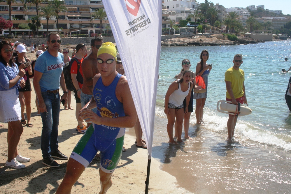 La prueba arrancó a las 10.30 horas con la salida de la categoría masculina, mientras que, sólo dos minutos después, salieron las féminas. Sergi Tur (CN Eivissa Triatló) acabó el primer tramo en cabeza, seguido de cerca por José Luis Gambacorta (Club Triatlón Ibiza Fanegas), que perdió un tiempo precioso en la transición tras olvidar quitarse el dorsal antes de echarse al agua.